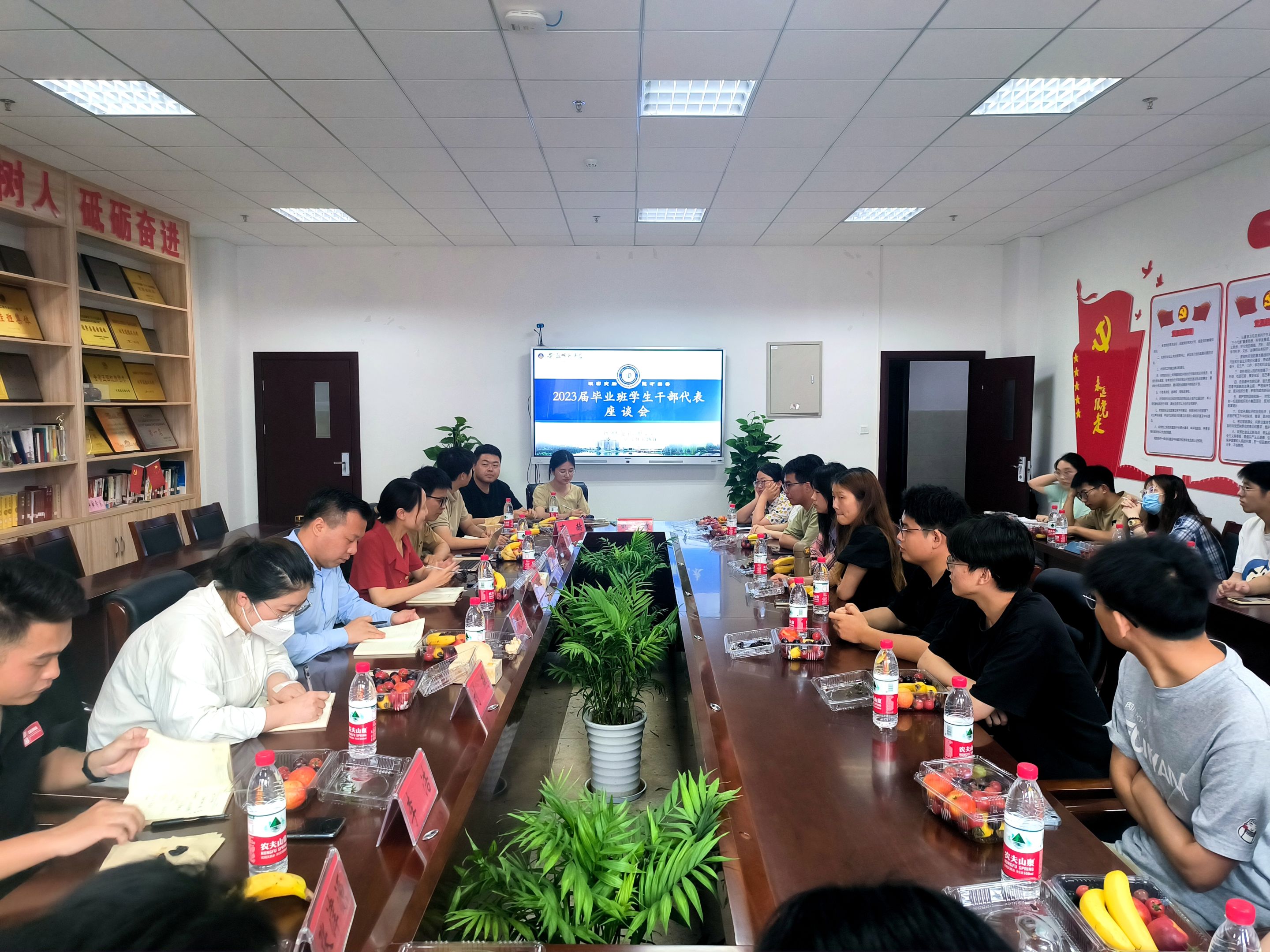 在在物理楼308会议室召开2023届毕业班学生骨干座谈会。学院党委副书记黄友生,团委书记刘冠琪,毕业班辅导员刘燕、邹孝龙、李浩,全体专兼职辅导员,曾在院团委、学生会、社团、班级任职的毕业生学生骨干代表和现任学生骨干参加会议。