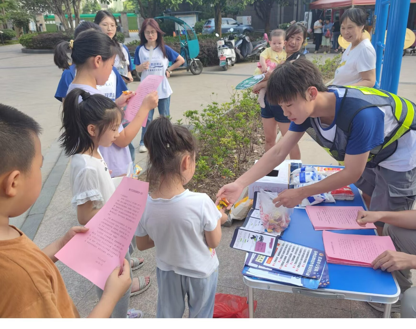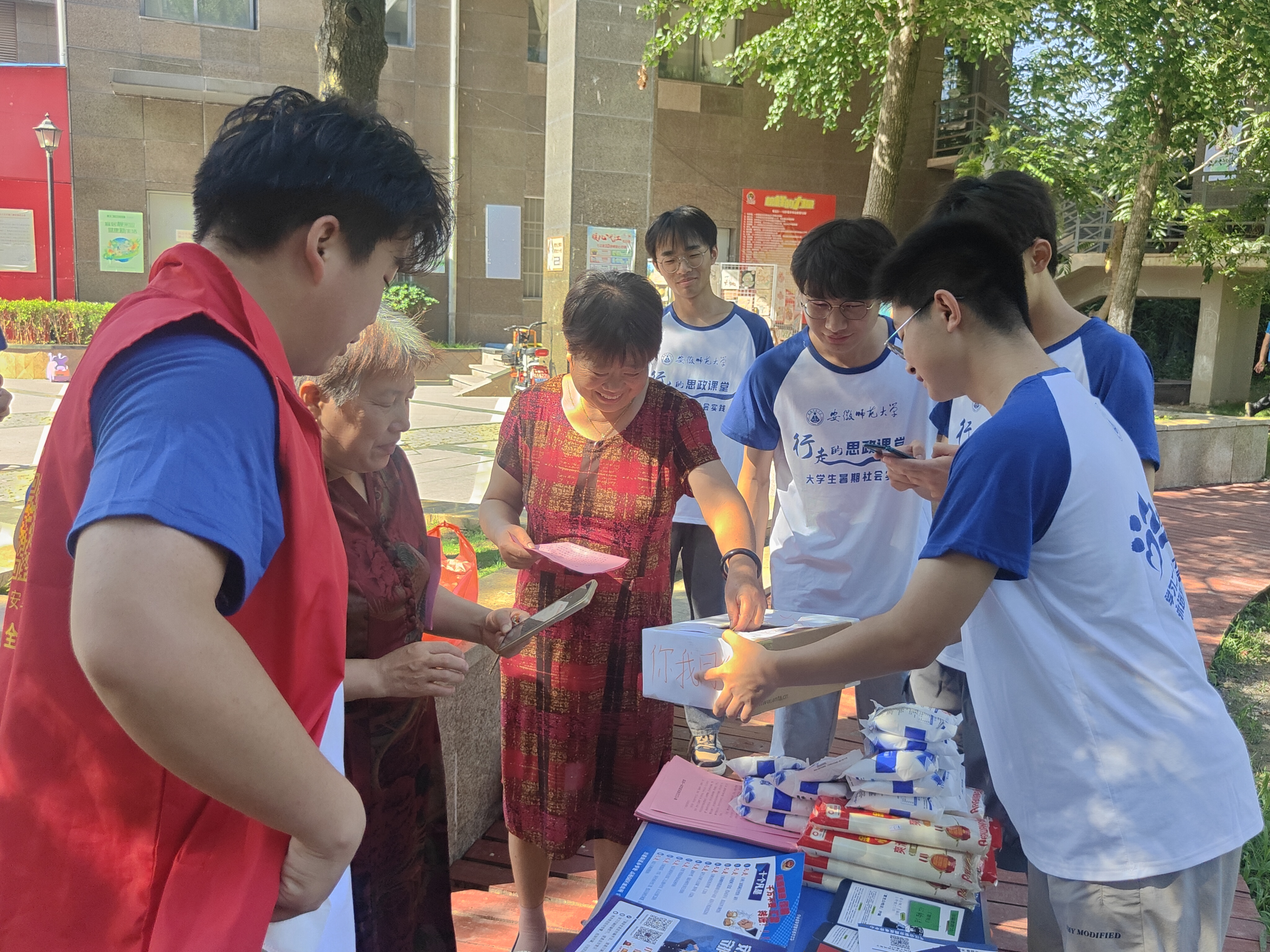 社区内,队员们两两组队,身着派出所警务人员提供的“江淮义警”和志愿者服装,手持防诈手册和防骗手扇,在烈日下散落在社区的各个角落,面向社区老人、儿童、青年等群体,认真讲述10条常见的诈骗手段。“奶奶,如果有人给你打电话说你儿子突然出事急需要用钱,让您打钱,您一定要让其他人打电话跟您儿媳妇确认......”为了让社区居民更加深入了解电信诈骗的骗术,实践组全体成员运用通俗易懂的语言,结合生活中的实例向居民们讲解电话短信诈骗、网络兼职刷单诈骗、网络购物诈骗、校园贷类诈骗、网络交友诈骗、熟人诈骗、账号交易诈骗等常见的电信诈骗形式,同时鼓励居民安装国家反诈APP,提醒居民及时接听全国公安机关反诈骗预警劝阻专线96110,为居民们再添一道反诈“防护罩”。