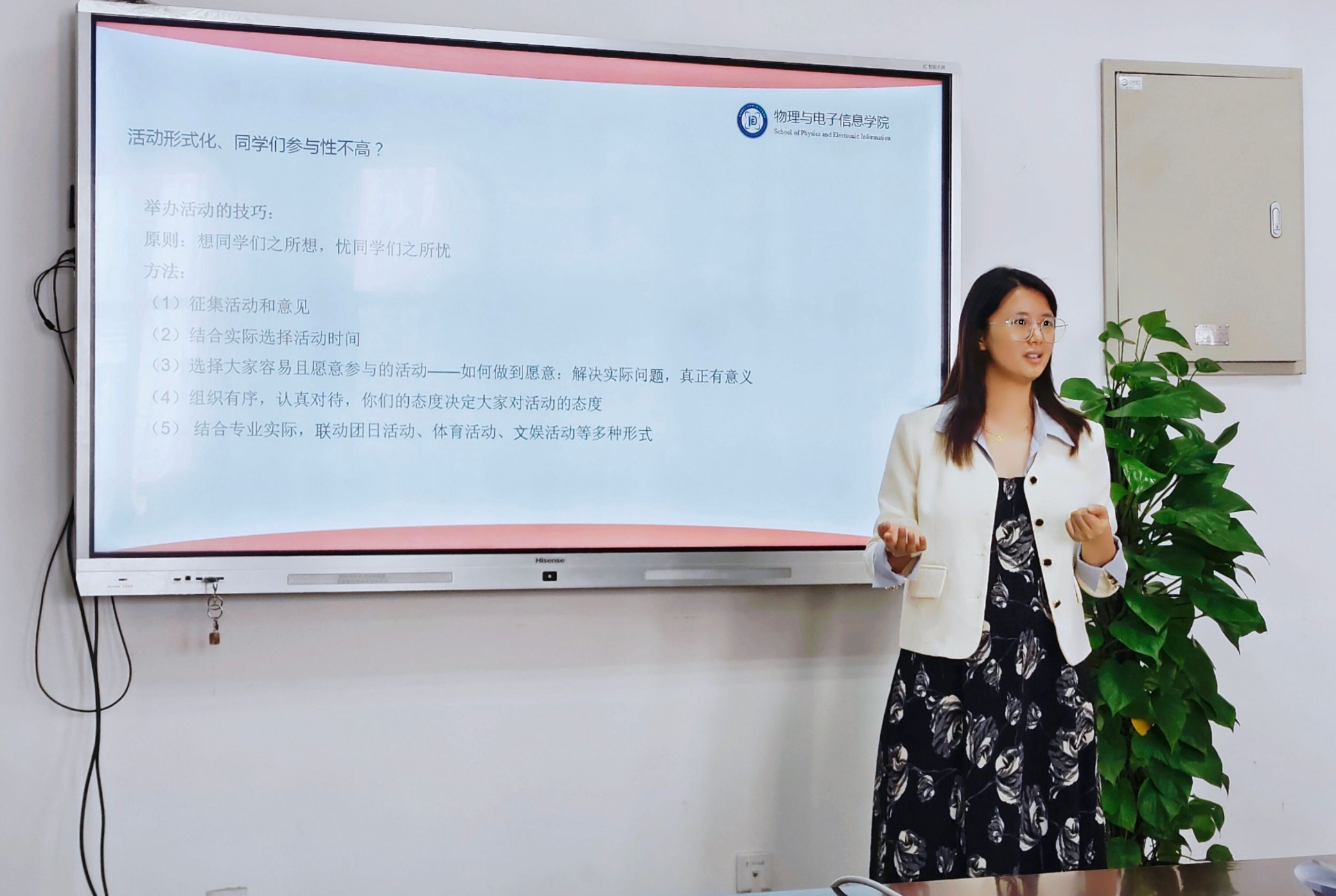在心理委员工作培训上,李慧芳向新任心理健康委员讲解,心理健康委员的担任什么角色?可以做什么?要做什么?李慧芳强调开展班级心理健康活动的开展应秉持“想同学们之所想,忧同学们之所忧”原则,以“解决实际问题,做到真正有意义”为活动目标。心理健康委员同时要注意工作方式方法,她强调心理健康委员应加强谈心谈话技能提升,提出制作班级心理“晴雨表”、问卷调研、多渠道了解情况、及时反馈辅导员等班级心理健康日常心理工作技巧,鼓励大家争做班级同学的知心人,心理健康工作急先锋。
