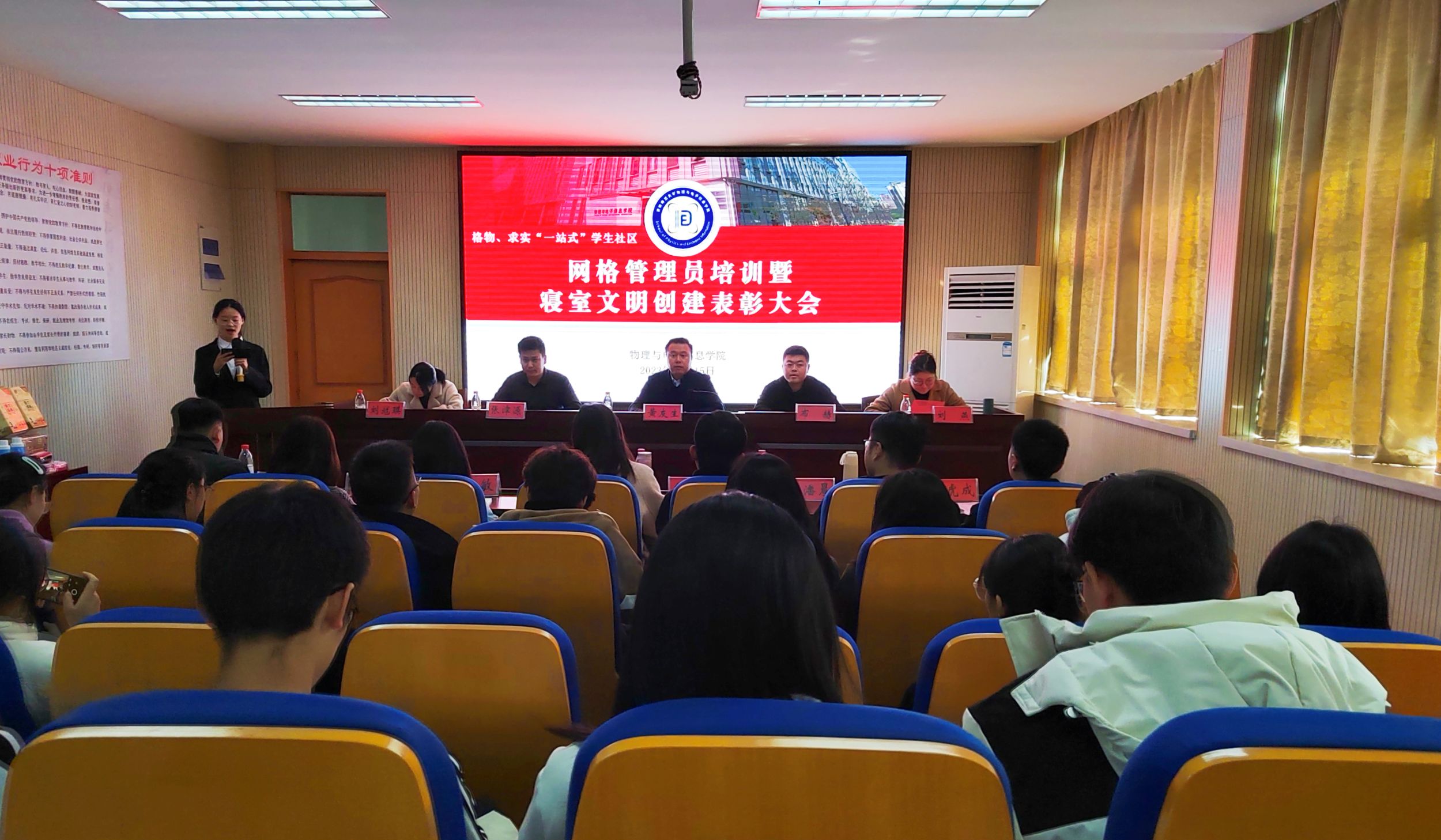 在学苑南楼三楼报告厅举办“一站式”学生社区网格员培训暨寝室文明创建表彰大会。学院党委副书记黄友生,学院团委书记张津源,全体专兼职辅导员,各年级班级生活委员、寝室长以及“一站式”学生社区学生楼、层长参加会议。