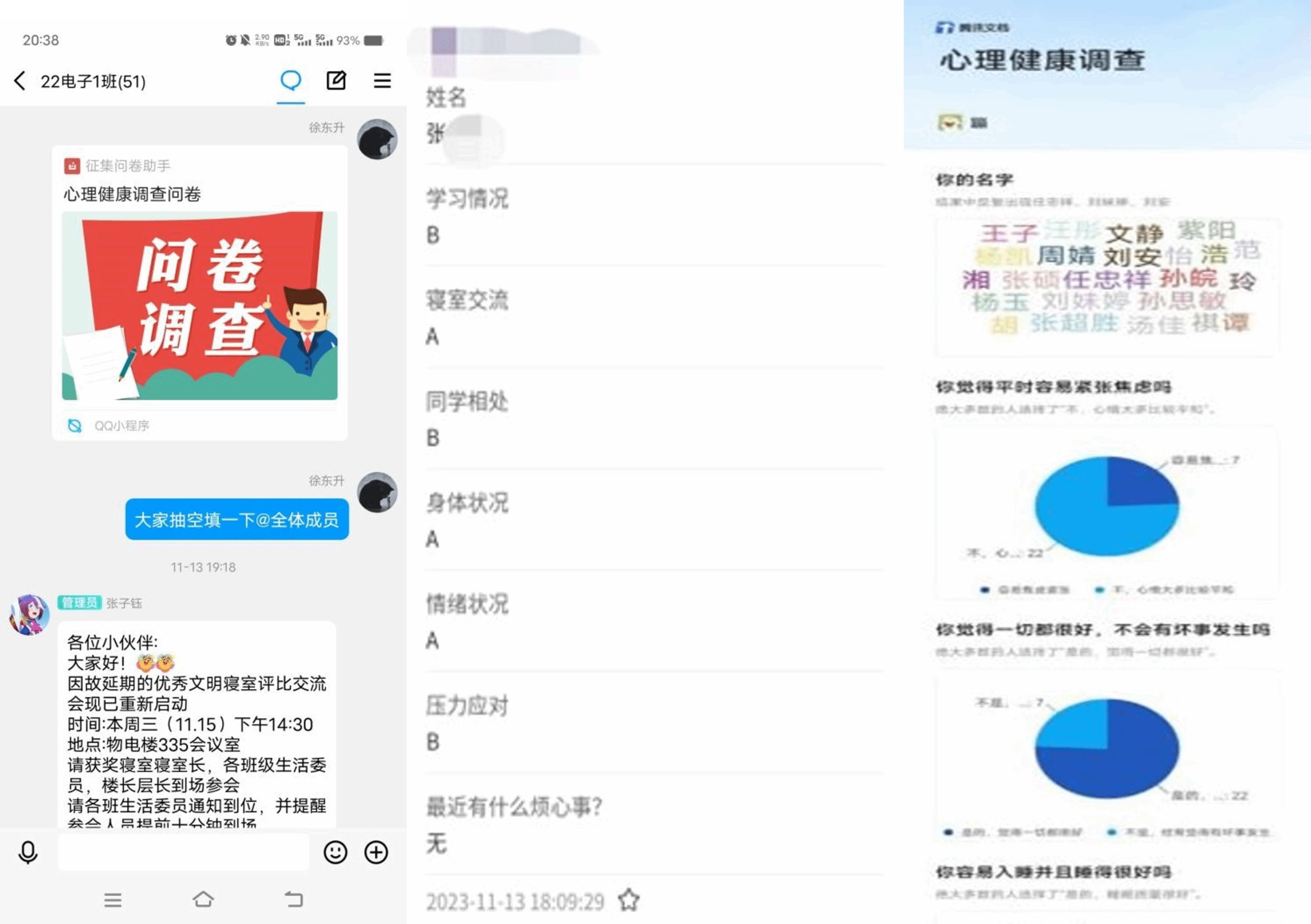 对话成长,在定制团辅中摸清底数。随着11月份临近,专业学习压力、考研压力和就业压力亦逐渐增加,焦虑、恐慌、迷茫和不安等情绪充斥学生内心。针对不同年级,学院定制“心理健康套餐”,帮助学生排解负面情绪。大一新生处在大学生活与专业学习适应期,学院组织“学长学姐面对面”,讲述成长故事,传授大学“秘籍”,引导他们做好大学四年规划;围绕大二、大三学生学习难、就业盲等问题,学院持续开展“教授面对面”和“电”亮未来主题讲座活动,特邀学院专业教师和名企资深人事部经理为同学们传道解惑,指明前进方向;大四考研临近,学院开展毕业生考研冲刺辅导,为学子助威打气并提供专业建议。此外,联动专业教师和辅导员,深入宿舍、课堂,走进学生生活,与学生开展谈心谈话,了解学生所需所困,班级定制心理问卷和建立班级心理档案,闭环跟踪,“摸清”学生心理状态。