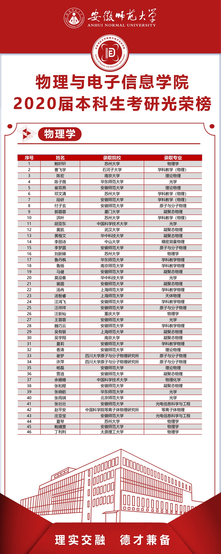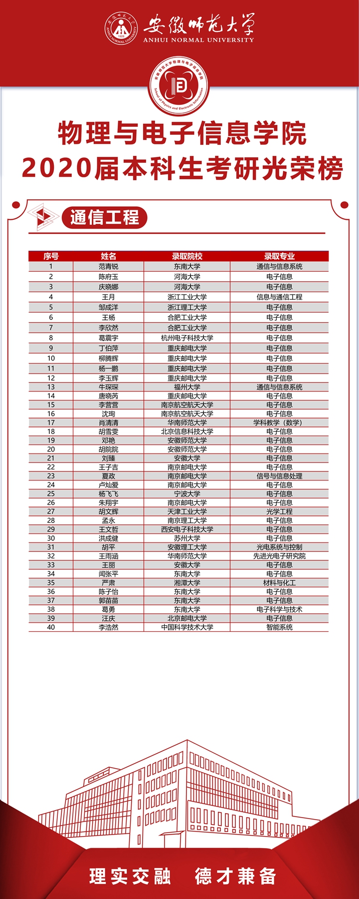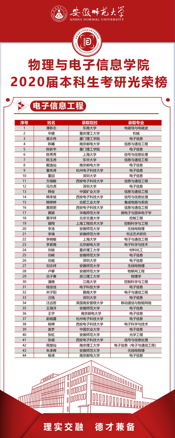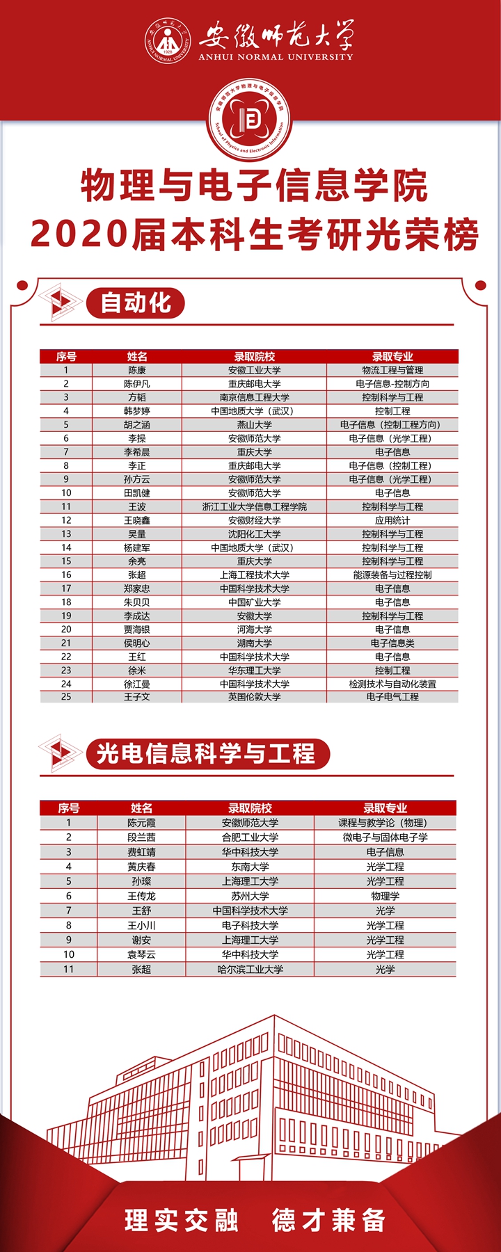 2020届本科毕业生升研率创历届新高。学院2020届本科毕业生共421人,成功考取研究生166人(含出国留学2人),研究生录取率39.43%,较以往提高近6个百分点。其中,物理学专业54.12%,电子信息工程专业35.48%,通信工程专业42.11%,光电信息科学与工程专业23.91%,自动化专业35.21%;进入“双一流”高校、科研院所人数占录取总数60%,含浙江大学、南京大学、中国科技大学、武汉大学、北京师范大学、厦门大学、英国伦敦大学等。
