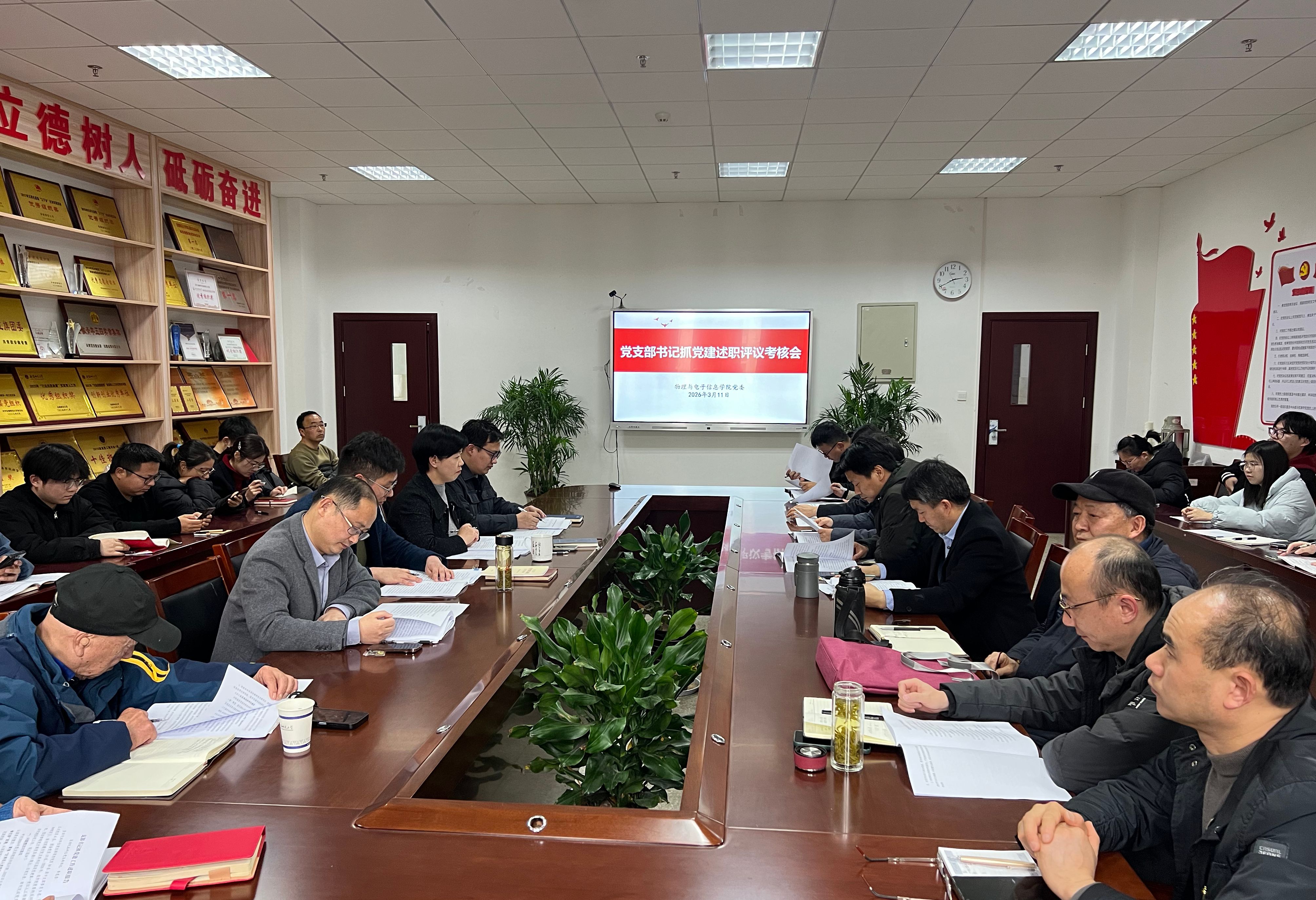 凌从祥首先对述职评议工作进行了具体说明。本次现场述职是物理学一教工、物理学二教工、光信息教工、电子教工、通信教工、自动化教工、退休教工党支部,物理学本科生第二、光电信息科学与工程本科生党支部,研究生第一、研究生第二党支部。另外6个党支部进行了书面述职。各支部书记对上年度问题整改落实情况进行汇报,重点就2025年履行职责情况、存在问题及原因分析、2026年党建工作打算进行了述职。