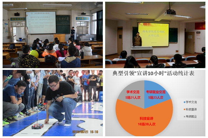 三是在典型引领方面,学生党员结合专业特长开展“宣讲10小时”活动,即学生党员在学院内开展学习交流、科技创新、考研就业等方面讲座或交流累计达10小时,发挥学生党员的传帮带作用。党员21人次开展学术交流5场、39人次开展科技创新交流16场、23人次开展考研就业交流5场,累计宣讲1231小时,分享自身学习方法、交流科技创新之路,用自己事迹感动、影响身边更多的人。经过党员的交流,学生积极参与论文大赛等活动,8人获得校本科生科研论文大赛校级奖励(含一等奖1人),学院荣获优秀组织奖。在考研就业方面,党员积极帮助学生梳理就业信息,改变同学就业观念,2016届毕业生就业率高达98.4%,位居全校第一,考研率达31.7%,创历年之最,学院荣获就业工作先进学院标兵称号。目前,十佳大学生李改有、专利达人王康景、赴西藏艰苦地区就业的张阿奎等一批党员成为学生眼中的榜样人物,也逐步成为学校内外靓丽的风景线。