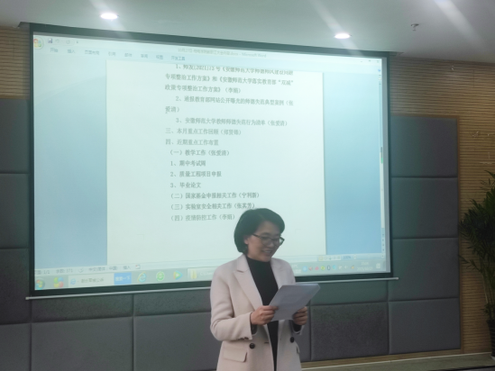 郑贤锋回顾了近一个月学院的教学、科研、群团工作等,对取得的成绩表示肯定,对存在的问题进行了分析与强调;李娟要求全体教职工高度重视疫情防控工作,严格落实疫情防控要求;随后,学院各分管领导对下一阶段的教学、科研、安全等工作进行了部署安排。
