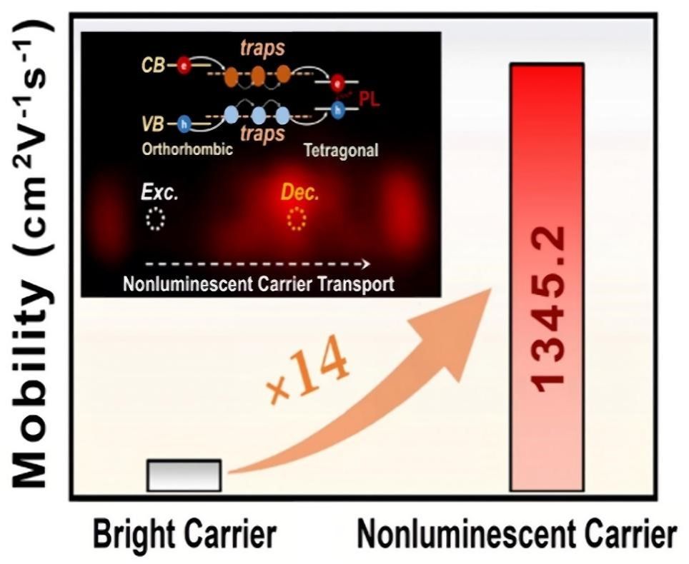 陆洲教授课题组与中国科学院大连化学物理研究所金盛烨研究员团队合作,在钙钛矿半导体载流子输运机制研究中取得重要进展。联合攻关团队利用自主设计搭建的原位温控-超快荧光动力学显微成像系统,揭示了甲胺铅碘(MAPbI3)单晶纳米线在低温条件下由相变诱导缺陷引起的非辐射态载流子长距离输运机制,并据此实现了高效的光电探测功能。研究发现,在零下130摄氏度的相变临界温度条件下, MAPbI3处于正交相和四方相两种晶相共存的状态,巨大的结构应力导致其晶格产生大量的相变诱导缺陷。这些相变诱导缺陷不仅并未阻碍载流子输运,反而可以捕获并“保护”载流子免受辐射复合和非辐射复合的影响,形成一种长寿命的非辐射态,使得载流子迁移率得到显著提升(1345.2 cm²V⁻¹s⁻¹),达到室温下自由载流子迁移率的14倍之多。基于这一特性,研究团队利用MAPbI3单晶纳米线构建了高灵敏度的微纳光电探测器,使光响应度提高了3倍。
